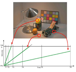 当曝光发生时,每个像素依撞击每个像素光线强度的比例进行电荷积累。一个强光源对一个像素充电要比一个若光源快得多。现有的模拟技术对所有的像素使用单一曝光,在曝光结束后,摄像机在每个像素上感应到积累的全部电荷。在曝光的快结束的时候,摄像机将在每个像素里感觉到整个的聚集电荷。这就意味着一些像素(亮光)可能感光过度而其他像素(暗光)可能曝光不足。
