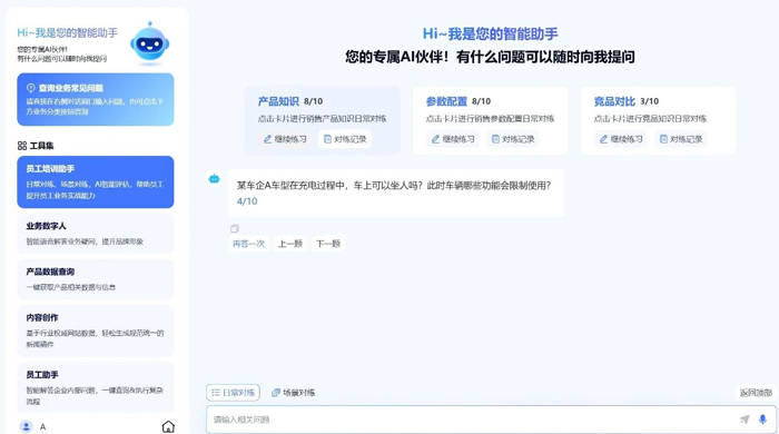 智能陪练解决方案能够依托企业核心资料——包括产品手册、竞品分析报告、销售标准话术及客户权益政策等,快速搭建贴合业务需求的销售知识库。系统通过智能解析企业知识库内容,可快速生成覆盖全品类的标准化培训问题及精准答案,并支持动态更新,确保员工接触到的始终是最新的业务知识,解决传统培训内容更新滞后的痛点。