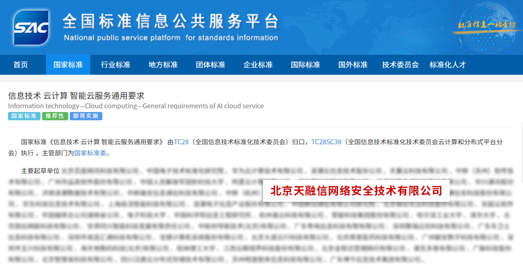 近日,国家市场监督管理总局、国家标准化管理委员会正式发布GB/T 46350-2025《信息技术 云计算 智能云服务通用要求》。该标准将于2026年2月1日起实施,是我国首个智能云服务领域国家标准,天融信作为核心起草单位之一为标准制定贡献专业力量。