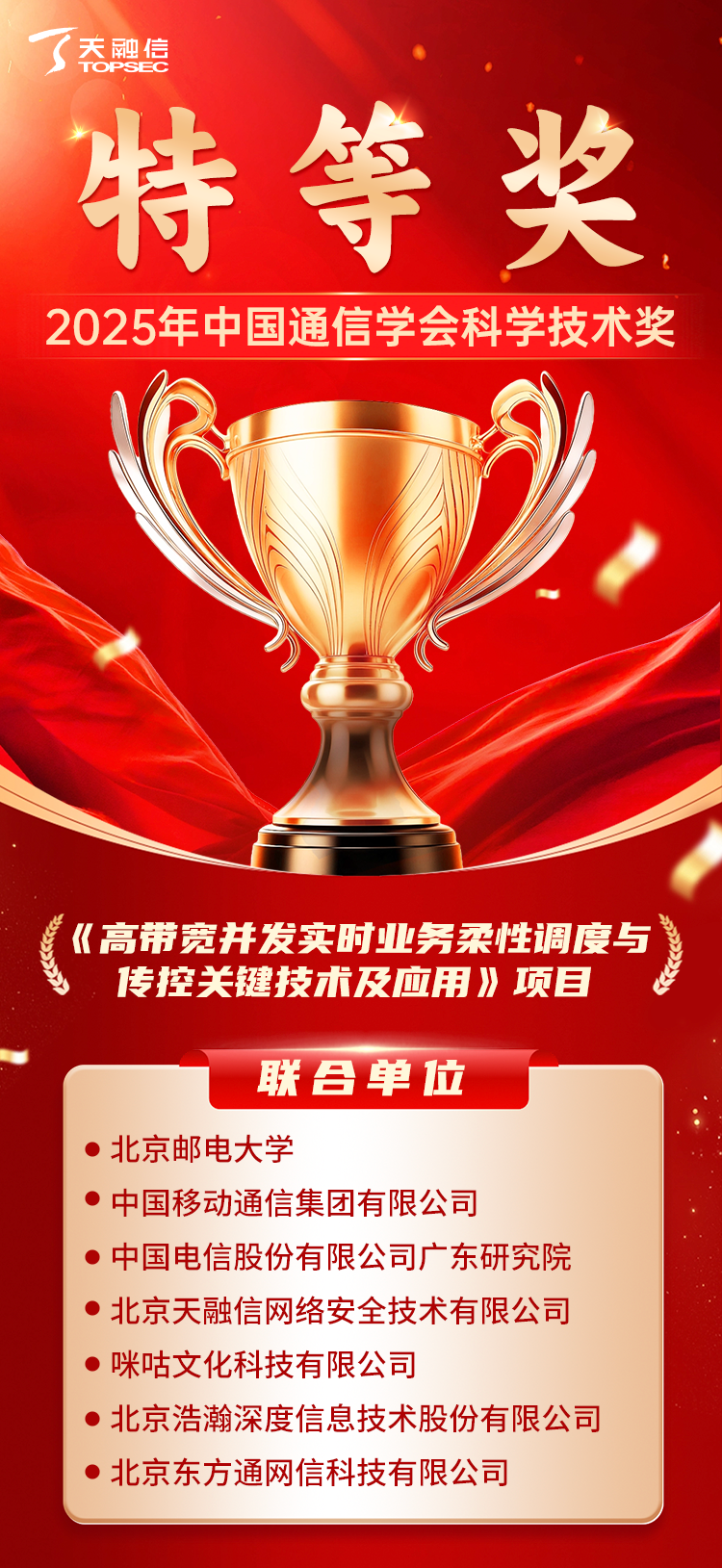 近日,2025年中国通信学会科学技术奖评审结果公示,天融信科技集团联合北京邮电大学等单位申报的《高带宽并发实时业务柔性调度与传控关键技术及应用》项目,成功斩获特等奖。中国通信学会科学技术奖是在信息产业部支持下,经国家科技部批准,由中国通信学会面向全国通信行业设立的经常性科学技术奖。《中国通信学会科学技术奖管理办法》明确规定,该奖项常规设置一、二、三等奖,特等奖为针对“特别重大的科学发现、技术发明或创新进步成果”增设的最高等级奖项。