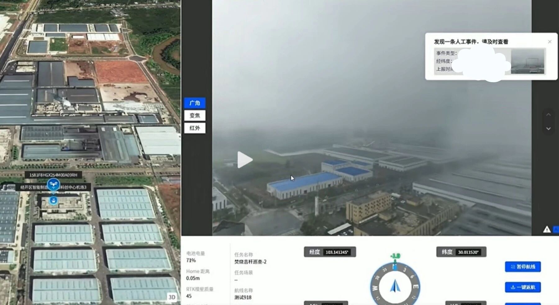 一飞统报。飞享家可一飞统报所有问题点,在飞行过程中同时运行AI算法库中的上百种算法,一旦发现兴趣点,立即上报指控大屏并自动派发工单,通过短信、邮件、系统等多种方式提醒后台人员,实时远程接管无人机进行喊话制止或采取其他动作,空地联动引导地面人员快速处置,完成事件处理的闭环。
