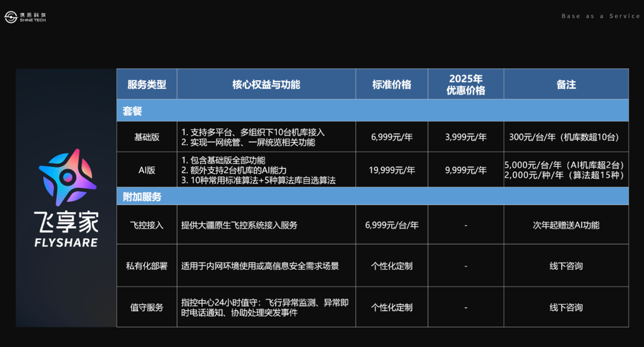 飞享家基于不同类型用户的不同需求,推出了基础版和AI版两个版本,最低每年只要支付6999元即可轻松享有。同时,飞享受家还可以根据用户的实际情况,提供飞控接入、私有化部署、专人24小时值守服务等增值服务,2025年12月31日之前下单购买,还有限时优惠和超值赠送,欢迎通过以下方式联系我们,共享低空经济时代红利!!