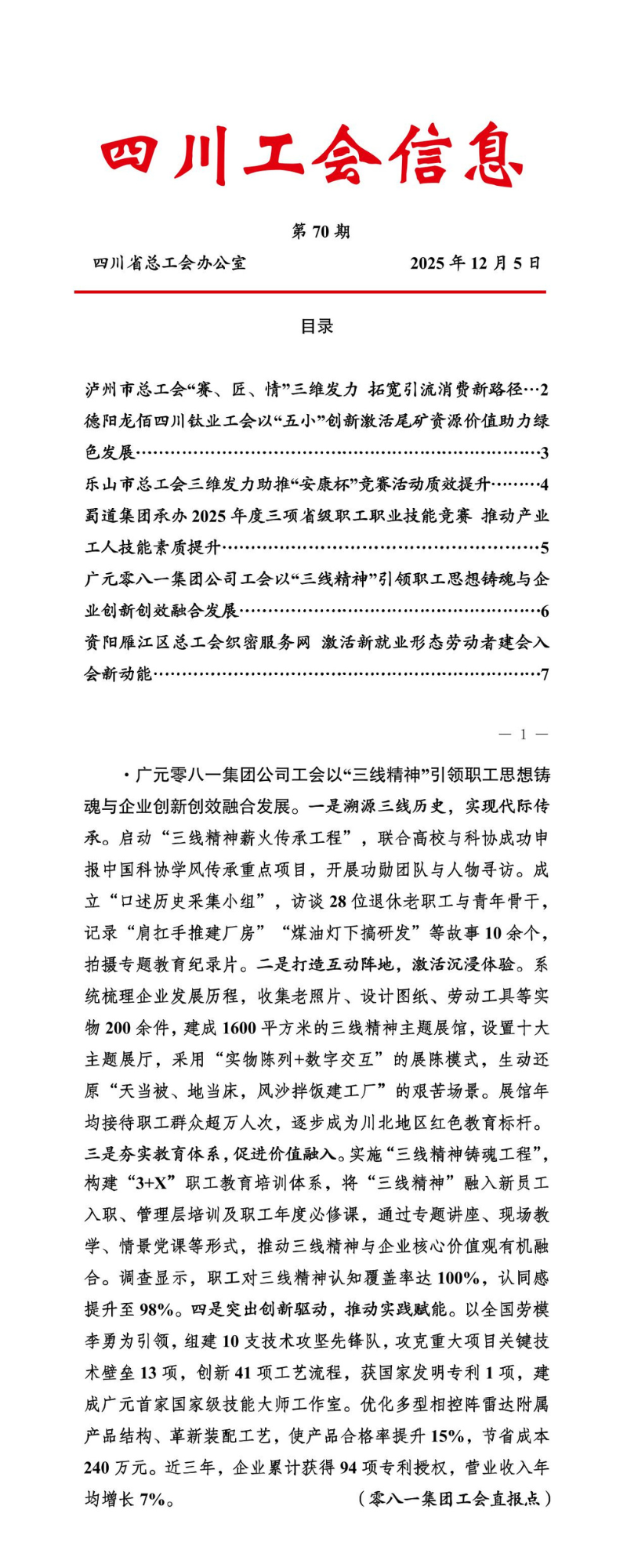 零八一集团工会始终将信息工作作为服务中心大局、凝聚职工合力、展现工作成效的重要抓手,通过健全机制、深挖内涵、畅通渠道,有效提升了工会工作的传播力与影响力。近期,零八一集团工会报送的《以“三线精神”引领职工思想铸魂与企业创新创效融合发展》专题信息,成功被四川省总工会《四川工会信息》采纳刊发,标志着信息工作取得阶段性成果。