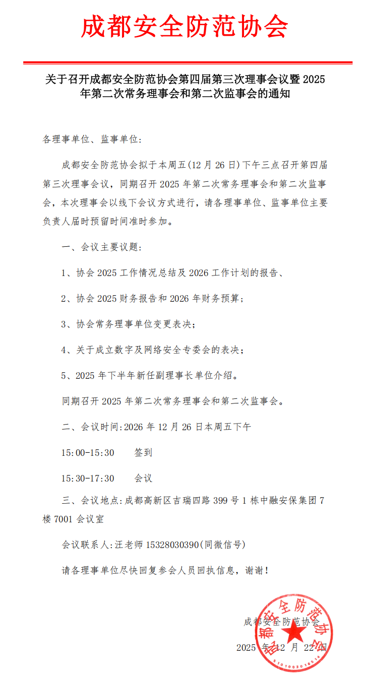 来源:关于召开成都安全防范协会第四届第三次理事会议暨2025年第二次常务理事会和第二次监事会的通知