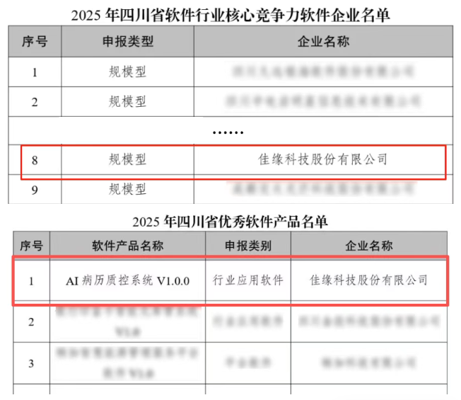 近日,由四川省软件行业协会主办的2025年度“名企、名品、名案”评选结果重磅揭晓。佳缘科技连续七年荣获“核心竞争力软件企业(名企)”。同时,旗下明星产品“AI病历质控系统 V1.0.0”也凭借卓越的使用成效与优秀的设计理念,被评为“优秀软件产品(名品)”。