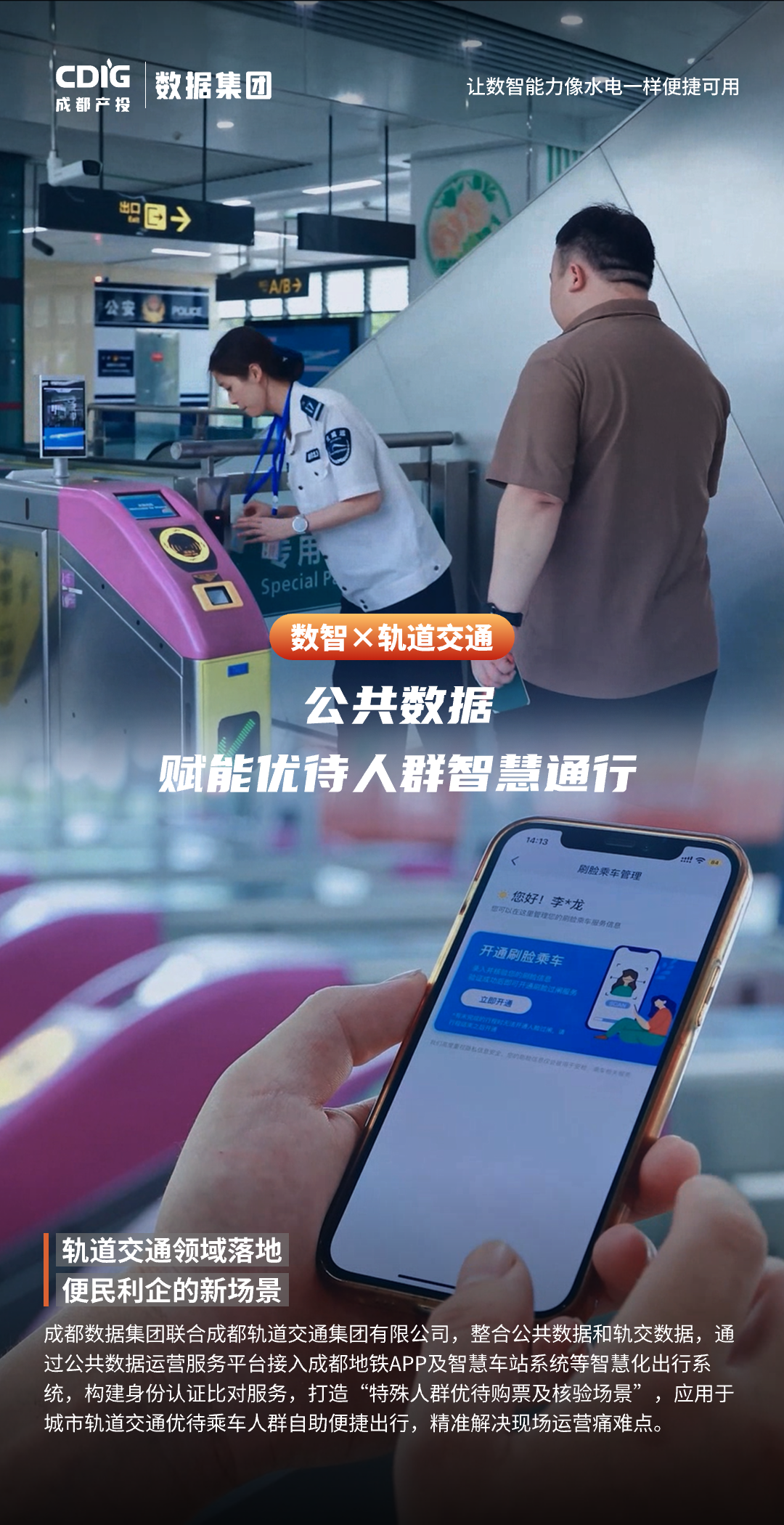 全国的城市轨道交通普遍施行优待人群免费乘车政策,由车站人员进行人工证件核验、手动开门放行,在执行中存在客流高峰期无法兼顾人工服务、核验服务点位较少、证件种类较多真伪性不好分辨等难题。成都数据集团联合成都轨道交通集团有限公司,整合公共数据和轨交数据,通过公共数据运营服务平台接入成都地铁APP及智慧车站系统等智慧化出行系统,构建身份认证比对服务,打造“特殊人群优待购票及核验场景”,应用于城市轨道交通优待乘车人群自助便捷出行,服务退役军人、残疾人等,精准解决现场运营痛难点。