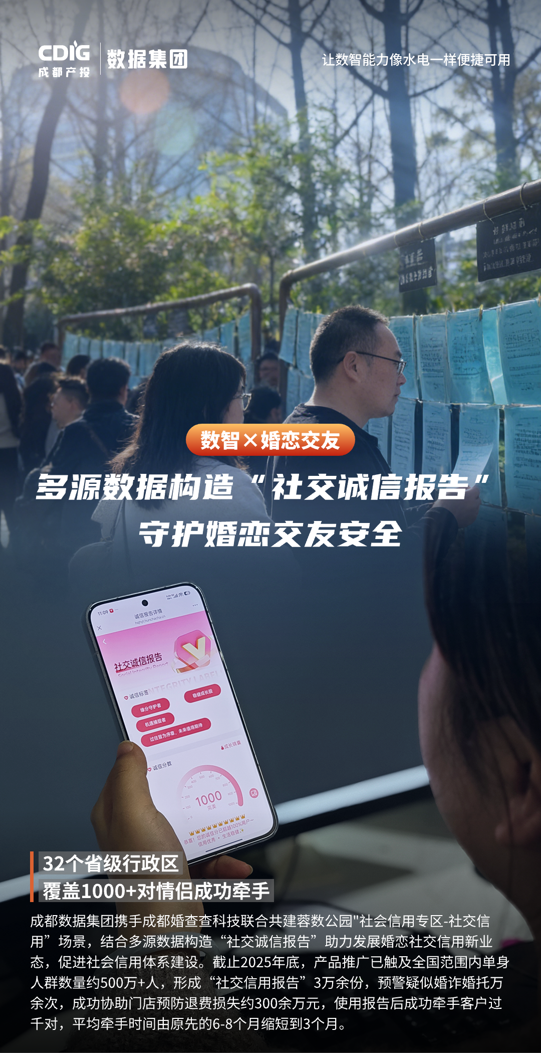 婚恋市场作为承载人类最美好情感需求的领域,却深受信息不对称、诚信缺失、风险难控等顽疾困扰。虚假信息、情感欺骗、财产纠纷等问题频发,不仅伤害了个体情感与家庭幸福,更严重阻碍了整个行业的健康发展。成都数据集团携手成都婚查查科技有限公司,依托“蓉数公园”打造社会信用服务专区,通过推动公共数据与婚恋社交场景深度融合,结合民政数据、法院数据等多维公共数据和算法模型,打造“社交诚信报告”产品,对于打破信息孤岛,构建婚恋交友场景的“全息信用画像”具有积极意义。