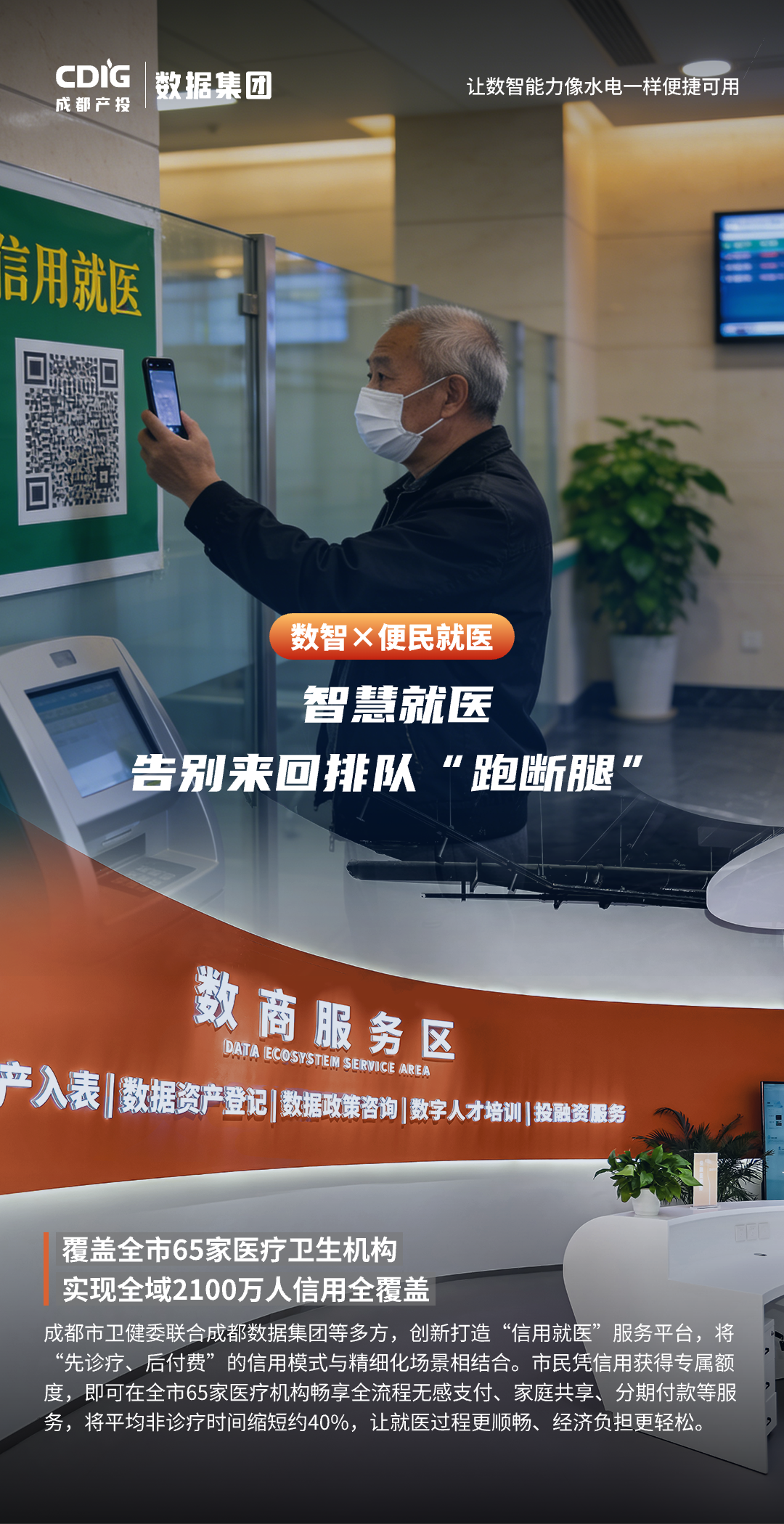 在传统就医模式中,患者及家属常面临挂号、检查、取药反复排队缴费的繁琐流程,“一老一小”存在数字鸿沟,突发大额医疗开支更是带来沉重经济压力。成都市卫健委联合成都数据集团等多方,创新打造“信用就医”服务平台,将“先诊疗、后付费”的信用模式与精细化场景相结合。市民凭信用获得专属额度,即可在全市65家医疗机构畅享全流程无感支付、家庭共享、分期付款等服务,将平均非诊疗时间缩短约40%,让就医过程更顺畅、经济负担更轻松。