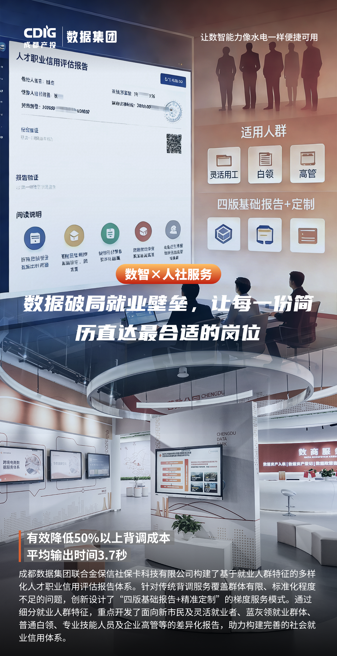 当前就业背调服务市场仍面临多项挑战,企业端缺乏权威数据支持,影响招聘效能,尤其在中小企业渗透不足;求职者因信息不对称面临摩擦性失业,人岗匹配效率偏低;治理层面,公共数据与社会数据协同不畅,“数据烟囱”制约公共数据价值释放能效。成都数据集团联合金保信社保卡科技有限公司,构建了基于就业人群特征的多样化人才职业信用评估报告体系,创新设计了“四版基础报告+精准定制”的梯度服务模式。通过细分就业人群特征,重点开发了面向新市民及灵活就业者、蓝灰领就业群体、普通白领、专业技能人员及企业高管等的差异化报告,助力构建完善的社会就业信用体系。