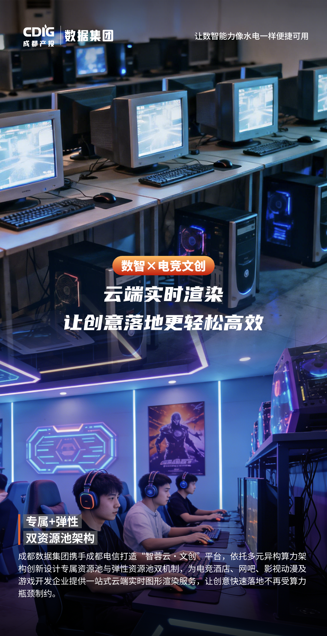 数字文创产业面临显著算力瓶颈,电竞酒店、网吧等场所受困于高昂硬件投入、频繁设备更新与复杂运维压力,影视动漫、游戏开发企业因本地专业渲染服务能力不足导致订单外流。成都数据集团联合成都电信前瞻性布局,依托“超算+智算+通算”多元异构算力服务架构推出“智蓉云·文创”品牌。通过“专属资源池”确保关键业务性能独享,“弹性资源池”实现算力灵活共享与高效流转,让企业无需自建昂贵算力设施即可按需获取顶级图形处理能力,极大降低技术门槛与试错成本,让创意快速落地、高效成型。