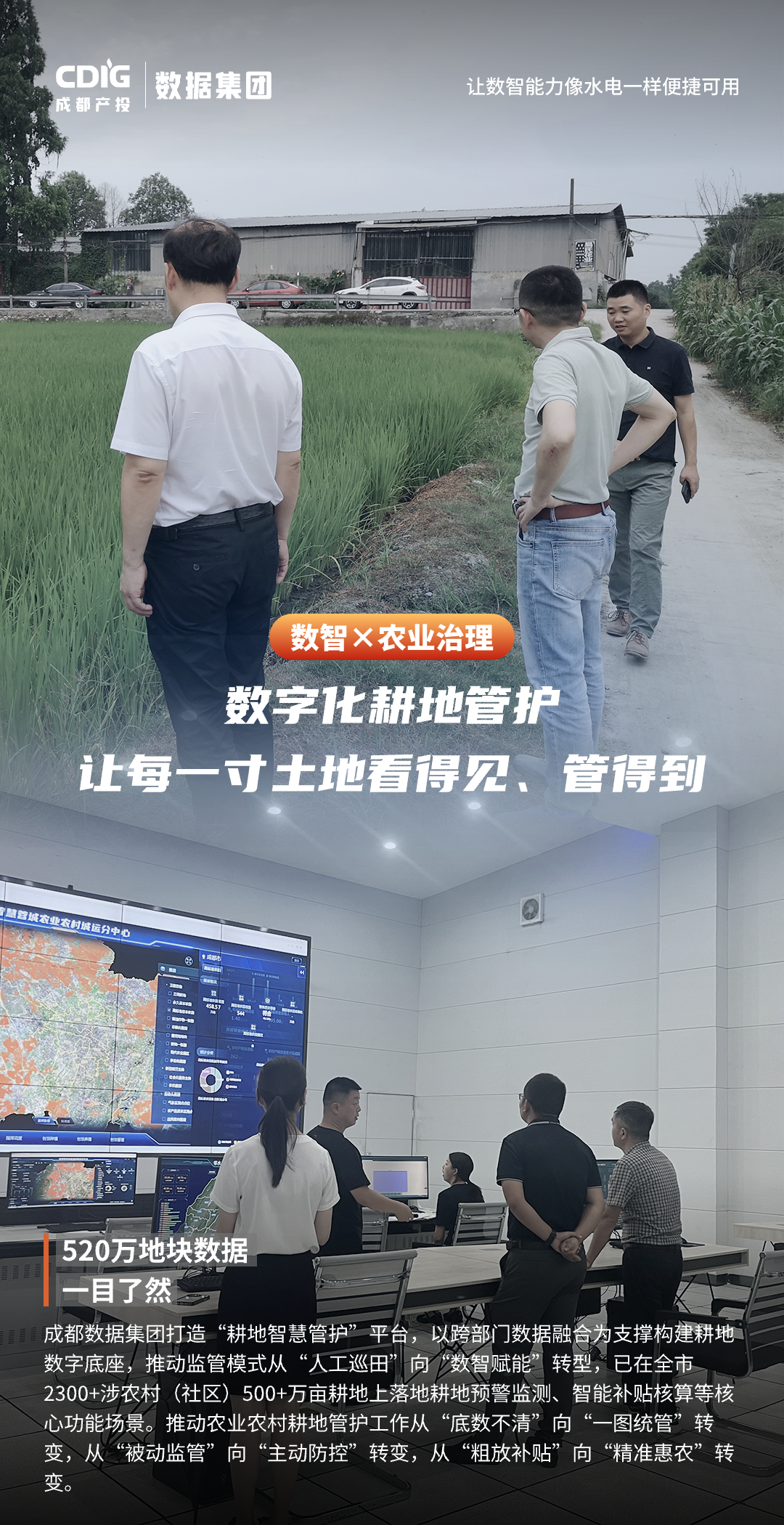 传统耕地管护中“人工巡田、纸质填报”模式效率低下,基层负担沉重,还存在监管数据难延续、补贴发放易出错等问题。成都数据集团打造“耕地智慧管护”平台,构建跨部门数据融合机制与耕地数字底座,通过深度融合农村耕地、高标准农田、遥感监测等多维度数据,实现全市耕地“一地、一码、一档”,通过对最小地块单元的精细化管理,搞清每块土地“在哪、谁种、种什么”,创新“数据赋能+主动服务”业务模式,实现耕地种植用途管控、规模化种植补贴落实等核心业务全流程数字化、智慧化。
