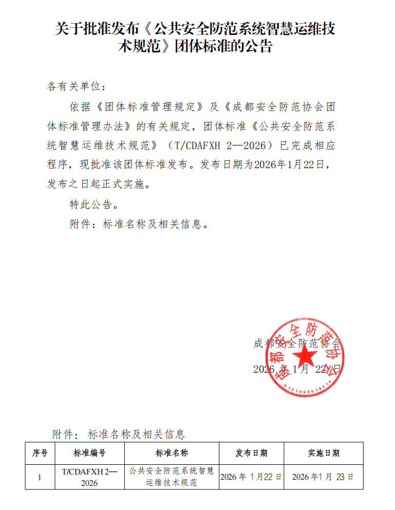 > 关于批准发布《公共安全防范系统智慧运维技术规范》团体标准的公告