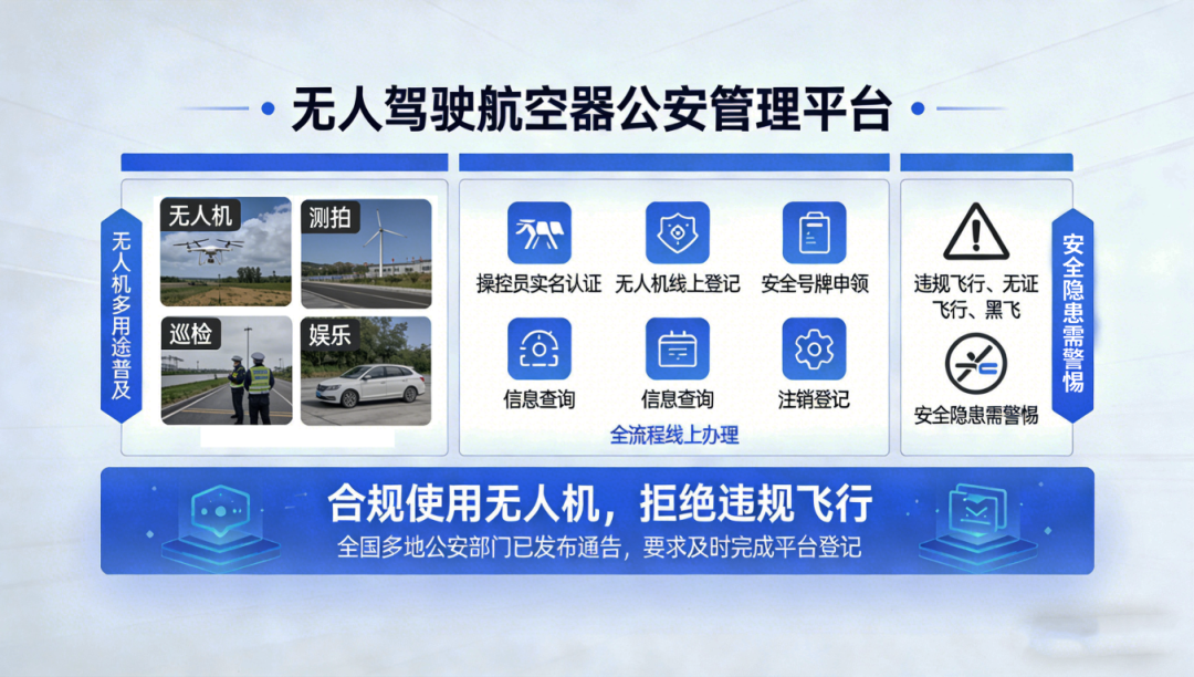 公安部推出无人驾驶航空器公安管理平台,是规范民用无人机管理、守护低空安全的重要举措,全程线上办理登记、备案、注销等业务,流程简便、高效快捷。