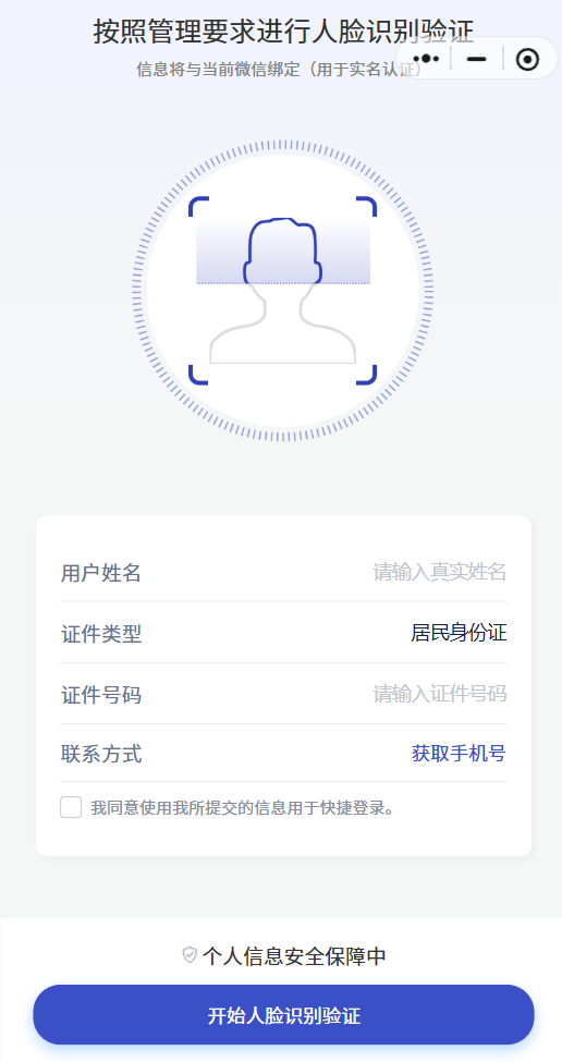 按照页面提示,依次填写本人姓名、有效证件号码、联系方式,完成手机号验证;随后点击开始人脸识别验证,进行人脸核验,核验通过即完成实名认证。