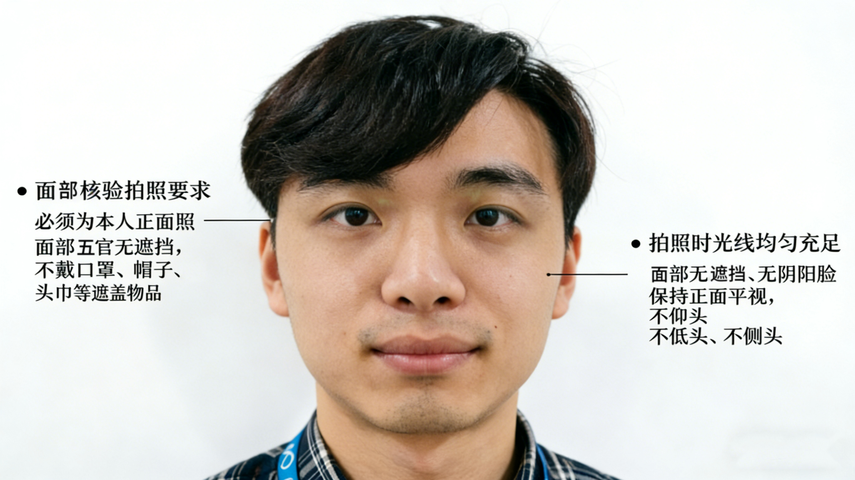 3. 拍照时光线均匀充足,面部无逆光、无阴阳脸,保持正面平视,不仰头、不低头、不侧头,照片中仅出现单人面部。