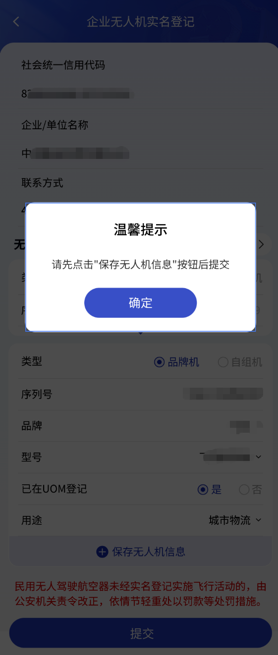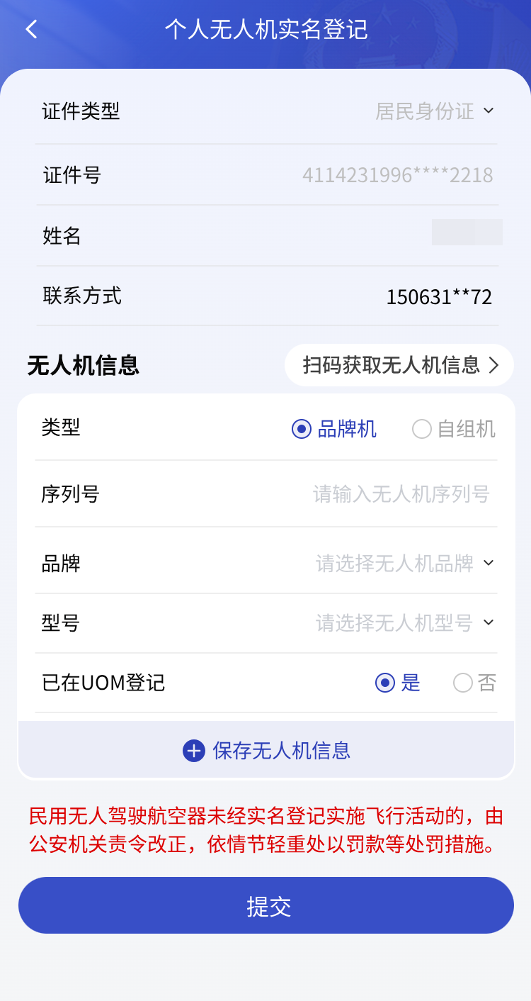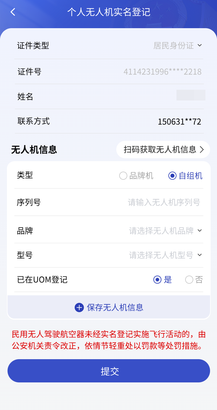 如果持有多架无人机,可重复上述步骤逐一添加,每架飞机信息填写完毕后,点击保存无人机信息,全部飞机录入完成后,点击提交,即可完成个人无人机实名登记。