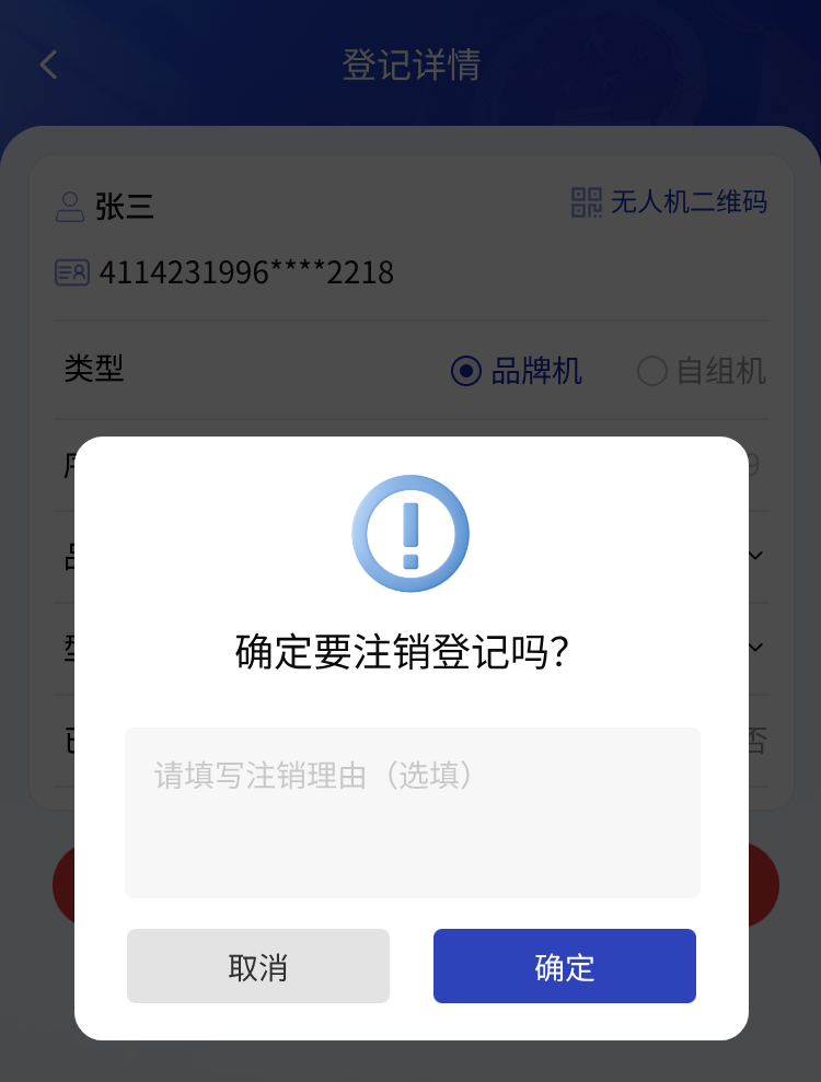 若无人机报废、转让、不再使用,可进入无人机登记详情页,点击底部注销登记按钮,填写合理注销理由,提交后即可完成注销,及时更新备案信息。