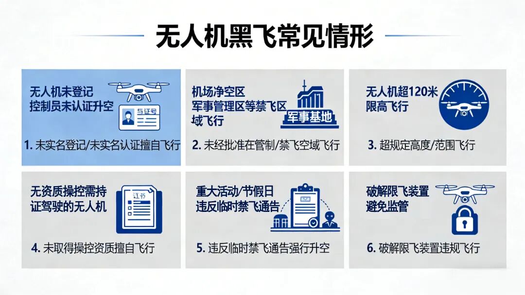 黑飞是指违反无人机管理规定,擅自开展飞行活动的行为,常见情形如下: