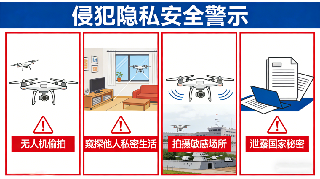 3. 侵犯隐私安全:部分人员利用无人机偷拍他人私密生活、窥探隐私、拍摄敏感场所,侵犯他人合法权益,甚至泄露国家秘密。