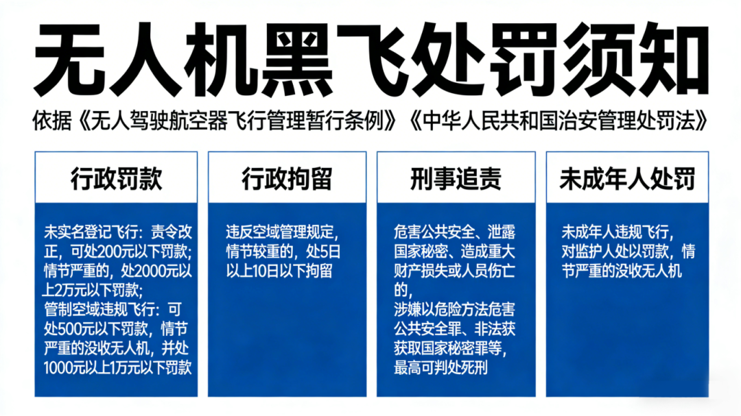 依据《无人驾驶航空器飞行管理暂行条例》《中华人民共和国治安管理处罚法》等法律法规,黑飞行为将面临严厉处罚,情节严重还会追究刑事责任。