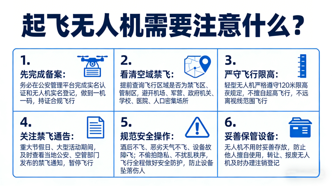 5. 规范安全操作:酒后不飞、恶劣天气不飞、设备故障不飞;不偷拍隐私、不扰乱秩序,飞行全程做好安全防护,防止设备坠落伤人。