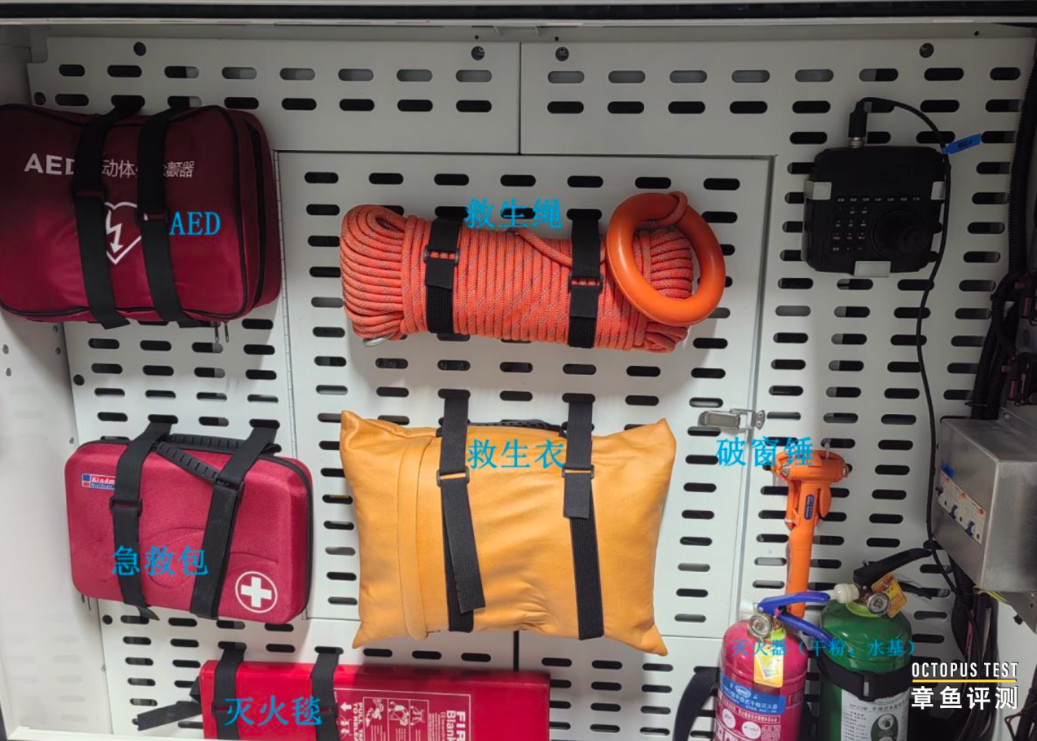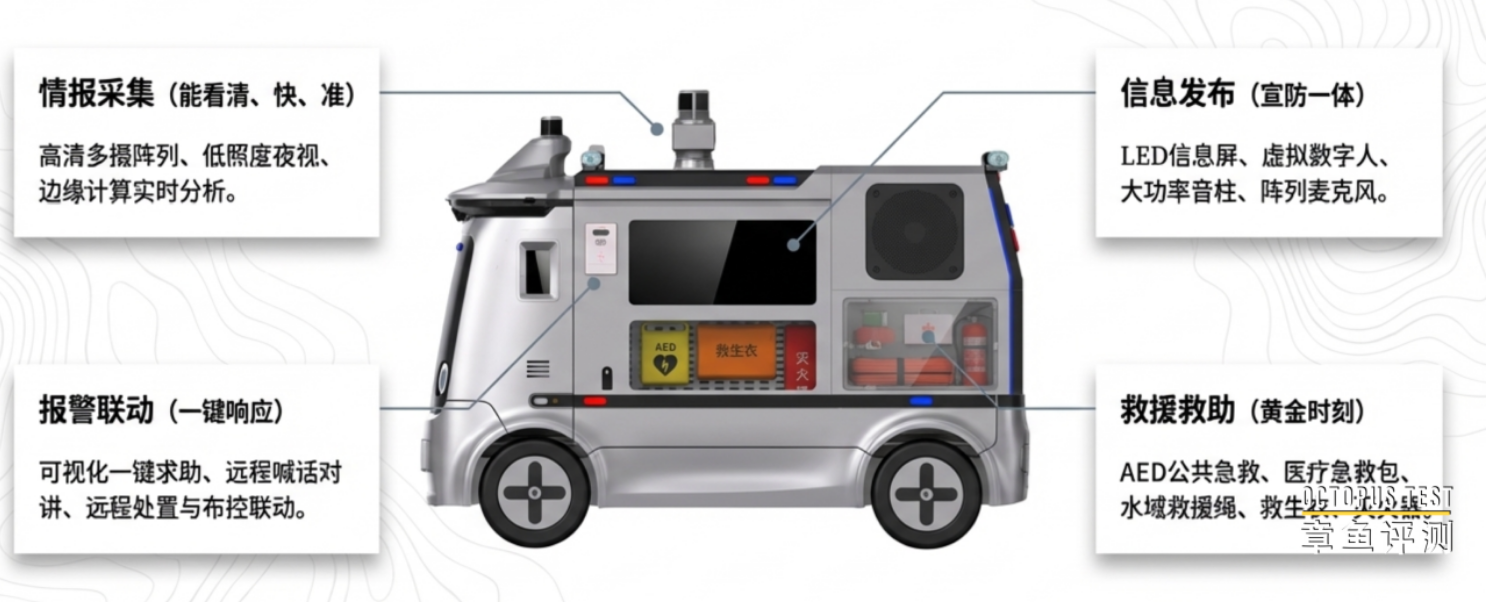 无人巡防机器人的机舱内,可以装备应急救援装备,AED自动体外除颤仪、急救包、水域救援绳、救生衣以及干粉/水基灭火器等。