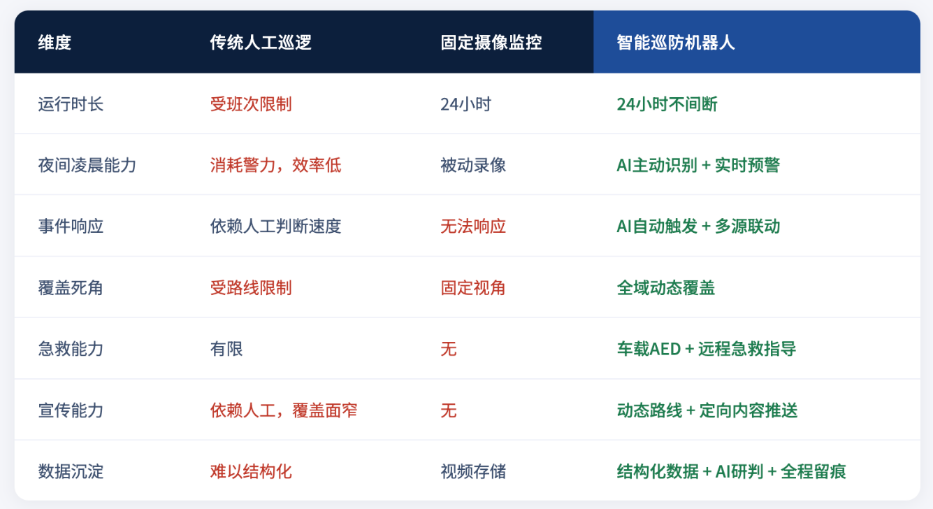 无人巡防机器人可主动识别火灾、水浸、烟雾等灾害隐患,以及异常聚集、黑飞无人机、重点人员徘徊等风险。