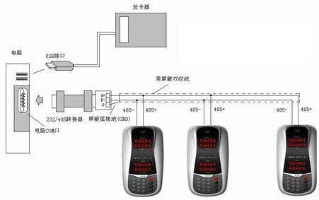 本系统由以下设备组成:计算机、RS485转换器(或TCP/IP-485转换器)、发卡器、收费机。系统网络如下:
