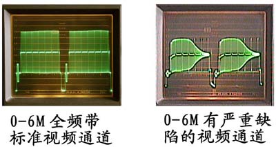 [左图]:上面为“0距离”双绞线传输特性(无源传输器达不到这个水平),0-6M全频带“无失真”传输;下面为对应的480线图像的传输质量;