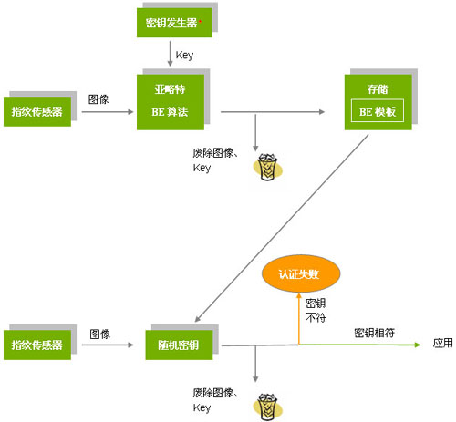 亚略特有关人士介绍,BE加密体系具体可描述为“Biometric Encryption,由生物特征值处理、加密密钥”的过程,用户在BE技术机制上,可以通过自己的生物特征来加密PIN或密码,以获得对计算机应用的准入和身份认证,它的核心优势在于:一,不保存生物特征值模板,而是保存BE模板(经过生物特征值处理加密的密钥模板)。二,用户本人每次通过指纹激活加密密钥,不再像传统模式下由第三方组织来掌握、保管加密系统的核心技术。三,基于指纹读取的随机性,确保每次产生的密钥也随机变化且仅一次有效,从而显著提高密钥安全级别得。BE的技术原理图(以指纹识别为例)如下: